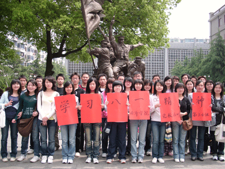 b. 为了顺利办好此次活动,让“学习八一精神,感怀历史,铭记过去,了解我党,服务人民”这一活动宗旨更加深入到每位组员心中,我们进行了前期与后期的各项宣传工作。主要工作如下:写上“学习八一精神”的大字贴;安排字报画报的宣传,并张贴在楼栋宣传栏中;搜集相关南昌起义的各种资料,加深了解!