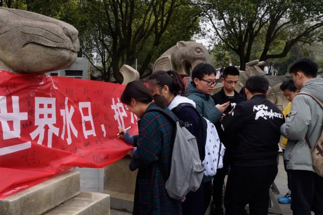 随着世界人口的增加,人们对水的需求也越发增长。在21世纪,水资源在人类的过度使用和浪费之下,已经开始变得稀缺起来,很多国家现在依然处于缺水的情况。为呼吁同学们节约用水,增强节水意识,活动开始前,和然社成员联系网新办,通过线上QQ和微信同时宣传“保护水资源”活动。活动当天中午12点整,和然社与办公室进行明确分工,由和然社负责麦庐摆点工作,办公室部长负责蛟桥工作。工作人员认真为同学们进行节水知识的科普,讲述了目前我国各个地区水资源的现状,强调了节约用水的重要性,并通过拍摄照片、观赏工艺品等让大家在活动中感受到节约水资源刻不容缓。同学们认真聆听,对工作人员分享的内容深表认同,纷纷在节水横幅上写下自己的名字,表示在日后的学习生活中定会注意加强自身意识,节约用水。