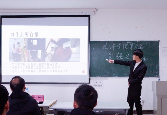 本次比赛的主题是“江海明志,人应自强”。经过初赛的激烈角逐,共有九位选手晋级决赛。决赛分为个人展示、自强问答和颁奖仪式三部分。首先,各位选手依次上台通过一段视频介绍自己,并结合PPT在规定的时间内进行演讲。选手们自信十足地向观众分享一个个自强事迹,他们面对困难不退缩的恒心,热心公益、服务社会的爱心,牵挂父母、分担家庭负担的孝心,努力学习、完善自我的决心感动着在场的每一位观众和评委。个人展示结束后进入问答环节,勤工部负责人准备了十五道与自强相关的题目,涵盖与自强有关的历史故事、诗词和歌曲等方面,观众们也十分积极踊跃地加入进来。之后,万婧怡老师对本次活动进行点评,她说:“本次活动意在于挖掘和宣传大学生拼搏奋进的事迹,塑造当代大学生自强不息的形象。本次‘自强之星’的评选一改往年的风格,同学们向大家展示的更多的是积极向上的事迹,他们没有被生活上的困难击倒,而是将爱与希望传递给更多的人。”此外,万婧怡老师鼓励同学们要以参赛选手为榜样,培养自信自立自强的精神。最后,根据评委打分选出一、二、三等奖获得者,由老师为他们颁发证书和奖品,并合影留念。至此,本次评比活动圆满落幕。