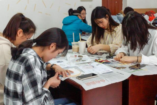 一方布、几色线,一双巧手可以创造一个世界。刺绣是中国民间传统手工艺之一,至少有两三千年历史。一种花纹展现出来的不仅是作品的灵动,更是作者的用心,平针绣、回针绣、直针绣、轮廓绣、雏菊绣、锁边绣、羽毛绣、十字绣、缎面绣、钉线绣……为了使图案更加逼真,刺绣板块的负责人一开始就向同学们演示了多种绣法,然后大家就开始专心致志地投入刺绣的作品中。无言地上下翻飞手指不是因为无暇交流,而是所有的言语和情感都寄托在一针一线之中。