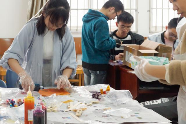 本次活动共分为五个板块,即扎染、剪纸、制簪、刺绣和美食品尝五个板块,每个板块都有负责人进行指导,参加活动的同学可以根据自己的喜好参与。