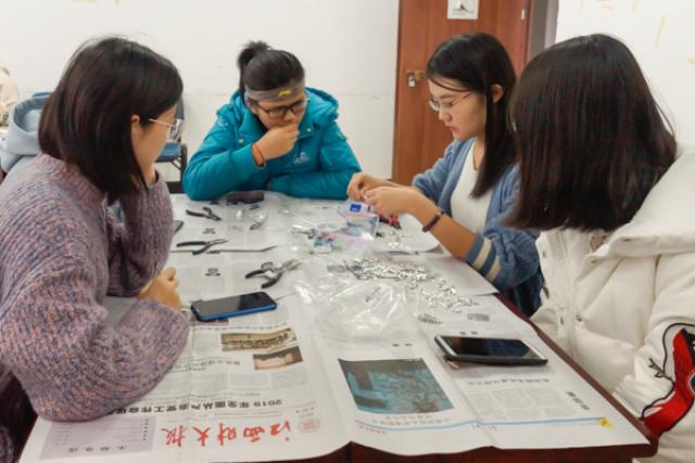 发簪在中国传统服饰的历史上占有浓墨重彩的一笔,从材料到样式、从种类到颜色,发簪的千变万化令无数人着迷。花鸟鱼虫、飞禽走兽,一包发簪材料包里的花片就让人眼花缭乱,更不要说颜色各异的珠石和各种搭配的工具了。在负责人的帮助下,同学们选好样式和颜色搭配,就用铁丝将各种材料组合在一起,看似简单的手法却需要无数经验和技巧。还有同学创意性的为自己的作品起名,或者根据一些诗词的已经进行创作,更是使诗意和发簪结合起来。