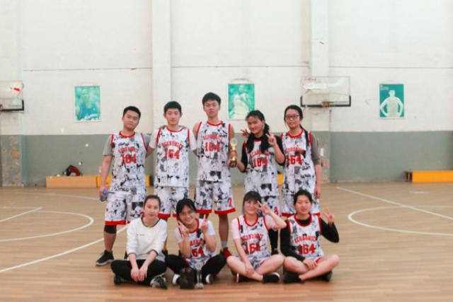 下午4点30分,164班与165班的女篮决赛准时举行。首节一开始,164班就凭借沈洁和郭梓樱双枪开火给对方一个措手不及,她们频频快攻得手,尤其是郭梓樱全场运球上篮得手,赢得一阵欢呼。164班的男生也凭借着高强度的防守为女生创造了更多机会。最终首节以164班14比3告一段落。易边再战,比赛更加的激烈。165班用自己顽强的意志创造机会,不幸的是165班队长叶帆因积极拼抢受伤下场。虽然165班袁承连续进球,却抵挡不住164双子星的进攻狂潮。在一波接一波的快攻中,164班早早宣告胜利。全场比赛结束,比分定格在22-8。最终164班赢得冠军。至此,比赛结束。