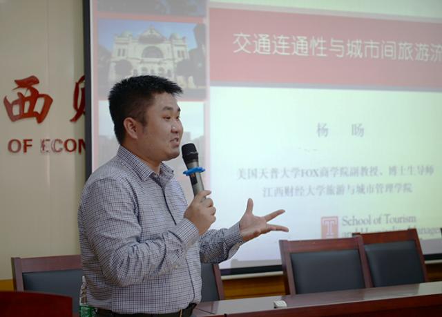 应成人直播 邀请,5月20日下午,美国天普大学FOX商学院副教授、博士生导师杨旸老师来成人直播 做了“交通连通性与城市间旅游流”的学术报告。张鸿儒老师主持了本次学术报告会。张利国院长、潘在副院长和师生共同出席了本次学术报告会。