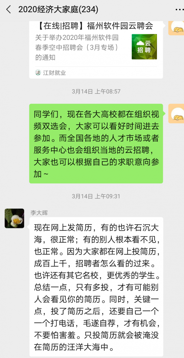 成人直播 院党委书记邹春发在毕业班班主任群里动员大家一定要督促好学生的就业工作,要关心学生面临的具体困难,提供帮助。院党委副书记李大晖在全体2020届毕业生微信群中,给同学们传授网络求职的经验,鼓励同学们在互联网环境下学会毛遂自荐,积极投递简历、联系单位。毕业班班主任老师扎实做好毕业生就业工作,在班级召开就业动员会议,为班上同学修改简历,推荐单位等。学院就业专员吴佩芹带领着院学生会就业部的学生干部积极做好就业动态数据的收集工作,一对一联络毕业班,为毕业班未就业的毕业生匹配符合求职意愿的企业,并向企业推荐毕业生。成人直播 就业指导服务中心还整理出学院典型就业行业、企业和岗位,帮助学生进行职业定位、邀请经验丰富的求职者在微信公众号上推出求职技巧、开通线上咨询渠道,建立毕业生联络微信群和信息收集公共邮箱、为学生提供线上修改简历和求职辅导服务等。
