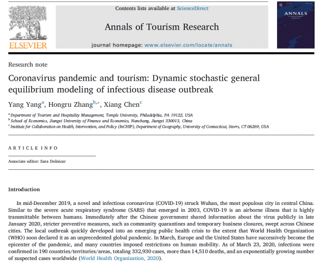 近日,成人直播 青年教师张鸿儒以通讯作者身份在旅游管理类国际顶级期刊Annals of Tourism Research上发表论文“冠状病毒大流行与旅游业:传染病暴发的动态随机一般均衡模型(Coronavirus pandemic and tourism: Dynamic stochastic general equilibrium modeling of infectious disease outbreak)”——论文DOI: //doi.org/10.1016/j.annals.2020.102913. Annals of Tourism Research是全球旅游管理领域的顶尖期刊,影响因子为5.493,英国商学院协会(The Association of Business School,简称ABS)出版的高质量学术期刊指南中将该期刊列为ABS四星期刊,在国内外具有广泛的学术影响力。