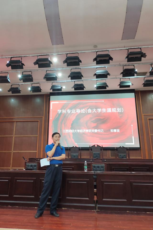 9月15日晚,成人直播 党委书记邹春发于麦庐园校区三教报告厅为新生讲授学科导论课程。