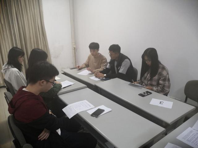 活动分成三个场次进行,每场面试安排了十二位面试者和四位面试官,分为不同论题的两组同时进行。待面试人员入场后,启航工作人员告知面试规则,并宣布面试开始。两组面试者在短暂的思考后由本组“破冰者”开始发言,面试者均十分投入,积极讨论。面试官仔细观察面试者的表现并在评分表上记录评分。在启航工作人员宣布讨论结束后,每组选出一位发言人向面试官陈述经过讨论得出的解决方案。