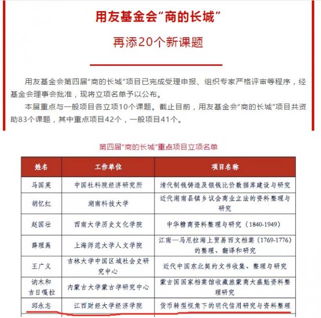 10月28日,北京用友基金会公布第四届“商的长城”项目立项名单。成人直播 邱永志副教授申报的重点项目《货币转型视野下的明代信用研究与资料整理》获批立项。“商的长城”项目系北京用友公益基金会致力于整理与保护中国的商业文化遗产而专门设立的经济史(商业史)横向项目,每年分别立项10项重点项目、10项一般项目,重点项目资助额度为30万元,今年获批立项率约为14%。