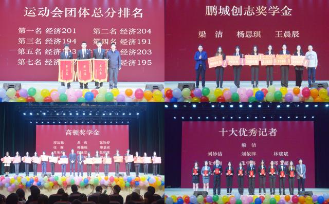 为表彰在各方面具有突出表现的同学,激励全体学生努力学习,晚会期间颁发了“鹏城创志奖学金”、“高顿奖学金”、“运动会团体总分前三”和“十大优秀记者”等奖项。(作者/刘妙洁 作者单位/成人直播 图/周亦君、张宇璐 图片作者单位/成人直播 )