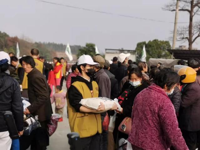 2020年12月25日,在都昌县敬老院粮食发放现场,曹钰莹正在搬运米袋