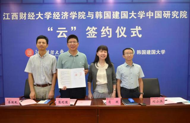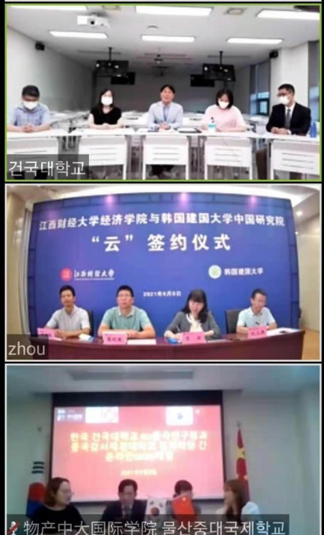 2021年9月8日下午,我校经济学院与韩国建国大学中国研究院进行线上交流,并进行“云签约”。参加签约仪式有韩国建国大学中国研究院朴商道院长,韩国建国大学中国研究院东亚乡村振兴研究中心金旭主任,中国物产中大国际学院院长李涛,校国际合作与交流处处长肖珑,成人直播 张利国院长、副院长李国民等,签约仪式由国际合作与交流处副处长刘小兵主持。