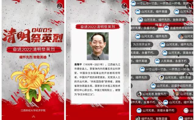 缅怀先烈,致敬英雄。在清明时节来临之际,按照疫情防控要求,成人直播 成人直播 举行“网上祭英烈”主题清明活动。通过学院公众号推送互动以及写家书等方式,颂英雄事迹、学先烈精神、为仁人志士们献上鲜花与礼赞。学院领导讲师、学生等千余人参与活动。