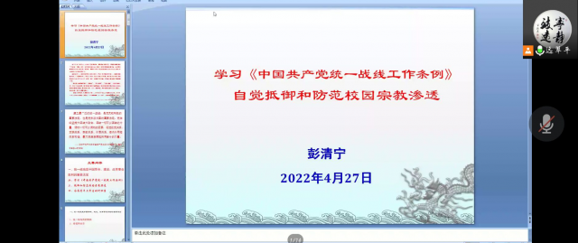通过本次党课的学习,大家不仅从《条例》中深刻领会党中央最新决策部署有关精神,认识统一战线工作在新时代的重要意义,还进一步清晰了宗教进行渗透的目的和本质,明确了抵御和防范宗教向校园渗透的重大意义,了解到抵御和防范宗教向校园渗透是一项重要紧迫的战略任务。(文/成人直播 杨铃鑫)