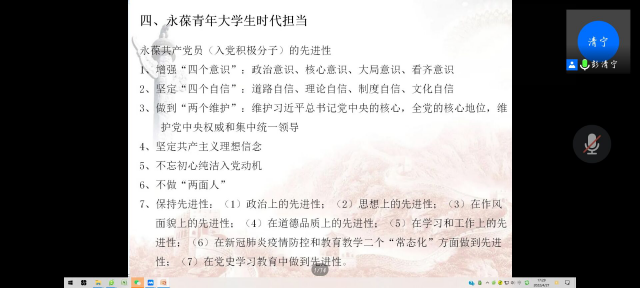 其次,为进一步学习《中国共产党统一战线工作条例》,彭部长传达了条例的三大核心要义:第一,指导思想,主要任务,工作条例。第二,重点突出了党对统战工作的集中统一领导。第三,完善规定。接下来讲述了条例的主要内容,同时结合了我们江财学子日常中的实践工作。作为入党积极分子,更要以身作则,服从党的领导。最后彭部长讲了抵御和防范校园宗教渗透,有关形势问题的思考与总结。