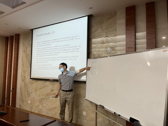 7月5日上午,香港大学刘挺军教授莅临成人直播 ,在北综815会议室为成人直播 师生带来了以“博弈论应用于金融学:管理层收购中的信息披露”为题的学术讲座。讲座由成人直播 副院长裘莹副教授主持,成人直播 院长张利国教授等院内外50余名师生聆听了本次讲座。