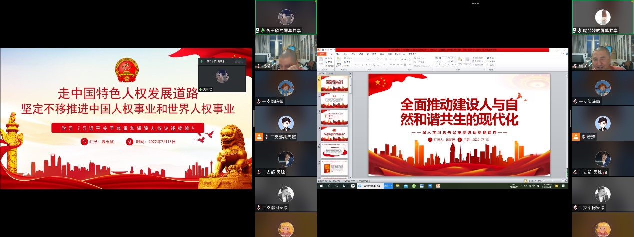 为隆重庆祝中国共产党成立101周年,弘扬伟大的建党精神,传承革命传统,赓续红色血脉。教育和引导各位学生党员不忘初心、坚定信念、展现新担当、新作为,以实际行动和优异的成绩向党的二十大献礼。2022年7月13日,成人直播 研究生第一、第二党支部通过采取线上会议的形式,联合开展主题为“扛起新使命 一起向未来”的七月主题党日活动。会议由第一党支部陈佳丽主持,研究生第一党支部书记谢尔艾力、研究生第二党支部书记杨柳及成人直播 全体研究生党员共同出席。