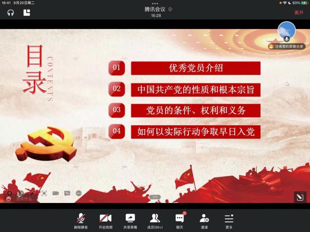 会议首先介绍了周佩瑶与傅欣添两位优秀党员同志,鼓励同学们向优秀党员同志学习,在大学四年中能够明确目标方向,在努力提升自我素质能力的同时积极服务社会服务群众,用实际行动践行党的宗旨,以党员的标准严格要求自己。接着向大家介绍了中国共产党的性质,党的根本宗旨以及指导思想,党员的基本权利和义务等党的基本知识。最后,呼吁新生端正入党动机、坚定信念,从学习、工作、生活等各个方面严格要求自己争取早日加入中国共产党。