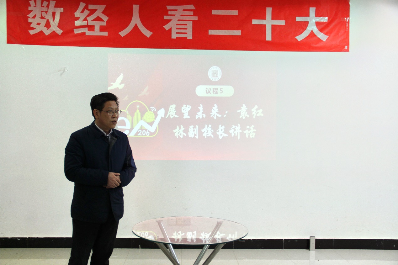 下午16时,袁红林来到位于22栋的学生活动室,参加了经济20级6班“数经人看二十大”主题班会,与同学们交流了学习党的二十大精神的学习体会。袁红林表示,党的二十大全面总结了过去5年的工作和新时代10年的伟大变革,深入分析了国内国际形势,系统阐述了开辟马克思主义中国化时代化新境界、新时代新征程中国共产党的使命任务等重大理论和实践问题,科学谋划了未来5年乃至更长时期党和国家事业发展的目标任务和大政方针,选举产生了新一届中央领导集体,审议通过了《中国共产党章程(修正案)》,取得了一系列重大政治成果、理论成果、实践成果,对于我们党在新时代新征程上团结带领全国各族人民全面建设社会主义现代化国家、全面推进中华民族伟大复兴,具有重大的现实意义和深远的历史意义。他对同学们学习落实好党的二十大精神提出了三点希望:一是要树立伟大理想,将小我融入祖国大我,把青春奋斗融入党和人民的事业 ;二是要脚踏实地,从小事做起,把专业学习和未来发展规划相结合,勇攀高峰,攻坚克难,练就过硬本领,为新时代的奋进之路贡献青春力量;三是要涵养道德情操,要锤炼品德,自觉树立和践行社会主义核心价值观,自觉用中华优秀传统文化、社会主义先进文化培根铸魂、启智润心。
