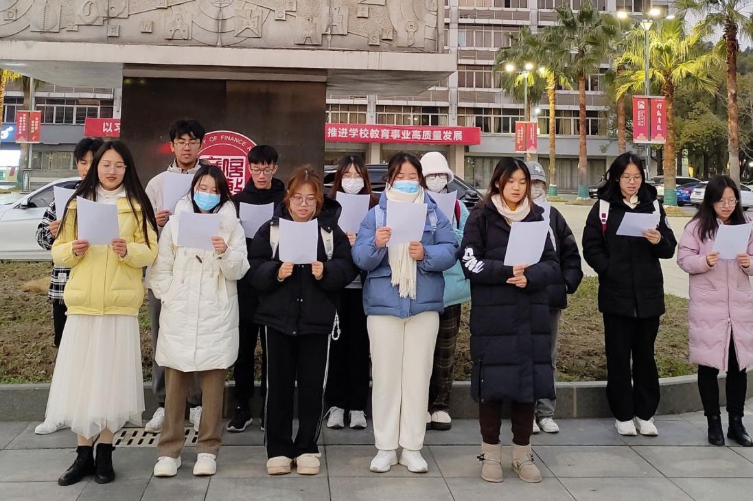 活动展开当⽇,⻘年志愿者协会成员提前五分钟到达崛起⼴场并有序集合,由活动负责⼈排列队形并发放⽑泽东诗词的纸质稿。在活动展开前,活动负责⼈向同学们说明本次活动的正式性、严肃性以及其对待个⼈和社会的重要意义,确保了本次活动顺利开展。