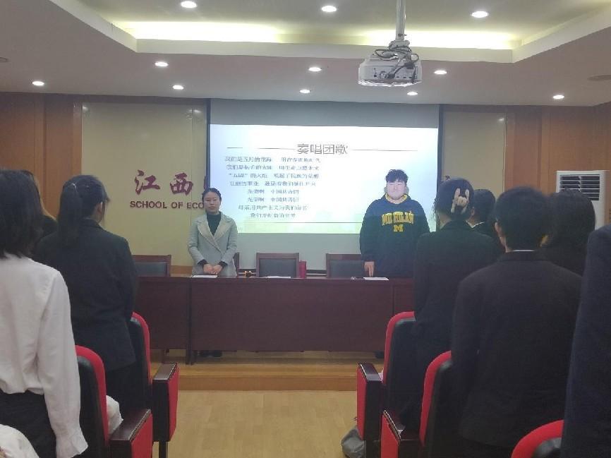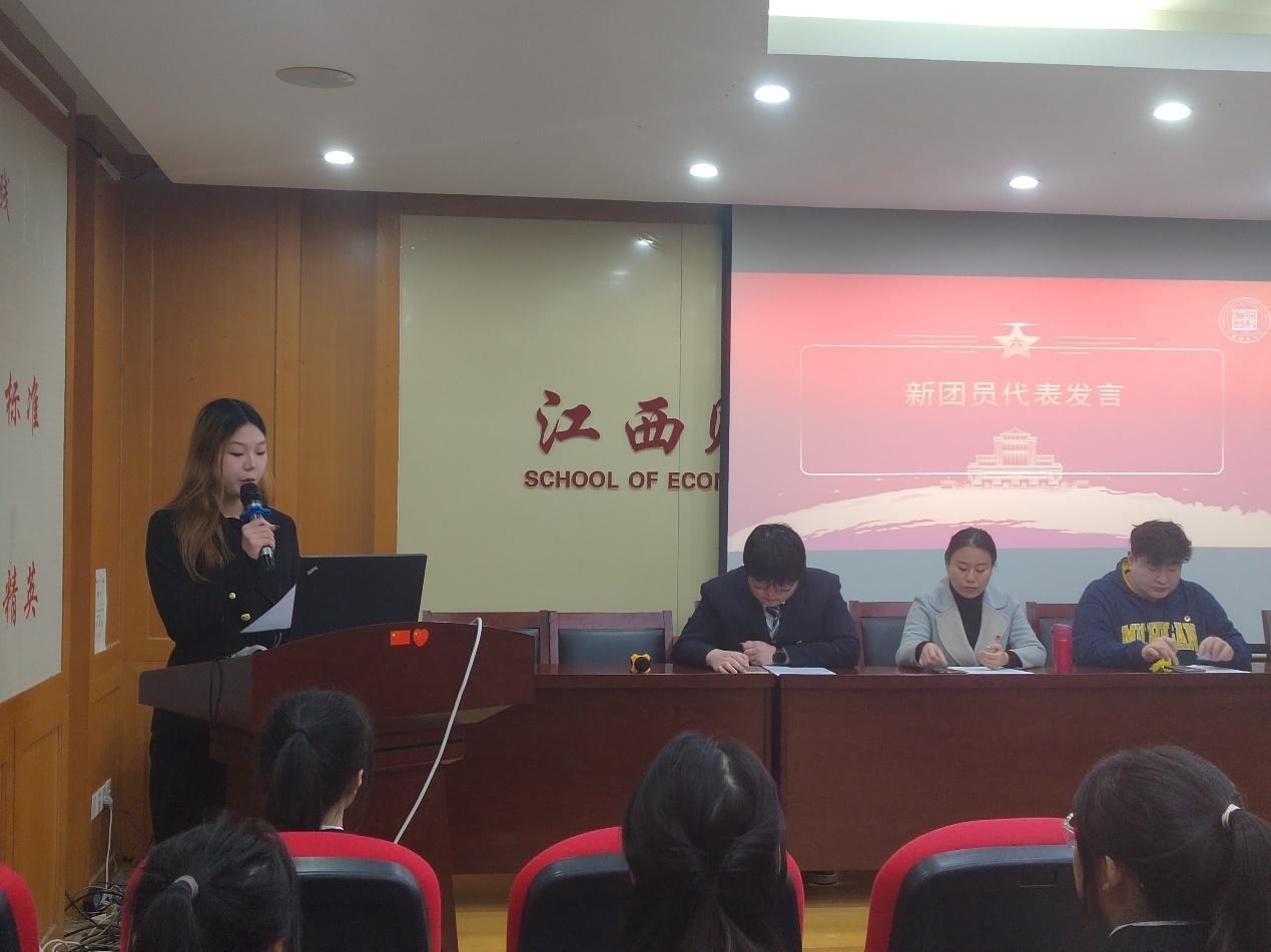 万婧怡老师代表学院团委向光荣加入团组织的各位新团员致以诚挚的祝贺。她指出,近年来我院团委在校团委和院党委的的坚强领导下,积极开展了丰富的学习、实践活动,涌现出江西省青年五四奖章1人,江西省青年讲师1人,江西省优秀共青团员2人等优秀个人,为广大同学树立了榜样。她希望心团员们胸怀大志笃信笃行,争做有理想的新时代好青年;披荆斩棘勇担挑战,争做敢担当的新时代好青年;默默无闻服务社会,争做能吃苦的新时代好青年;脚踏实地敢拼敢为,争做肯奋斗的新时代好青年。不负时代,不负韶华。