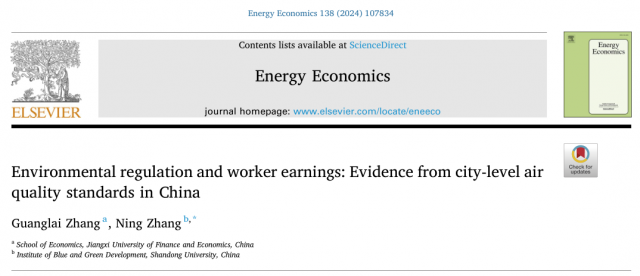 2024年10月,张广来副教授以第一作者在能源经济领域权威期刊Energy Economics发表题为《Environmental regulation and worker earnings: Evidence from city-level air quality standards in China》的研究成果,揭示了环境规制对企业员工工资福利的影响和微观传导机制。Energy Economics(经济学SSCI一区期刊)的影响因子为13.6,在全球597本经济与商业类别国际期刊中排名第一,也属于ABS 3星期刊。