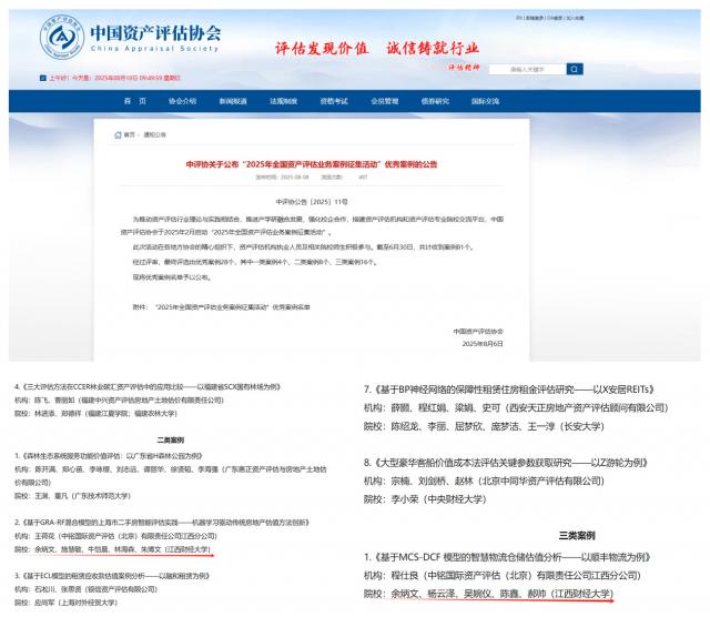 同时,资产评估校企协同育人项目课题组成员,还深入研究行业发展需要的技术攻关项目,与实践单位共同开发具有前沿性和应用性的评估技术,充分挖掘实务项目形成案例参加全国资产评估业务案例大赛,其中今年协同育人项目组参与组织编写的案例获得了全国资产评估业务案例大赛二等奖和三等奖各一项。其中,由余炳文、施慧敏、牛恺晨、林海森、朱博文主持参与,与中铭国际资产评估(北京)评估公司王荷花经理合作编写的案例《基于GRA-RF混合模型的上海市二手房智能评估实践——机器学习驱动传统房地产估值方法创新》,获得中国资产评估协会举办的2025年全国资产评估业务案例大赛优秀案例二等奖。由余炳文、杨云泽、吴婉仪、陈鑫、郝帅主持参与,与中铭国际资产评估(北京)评估公司程仕良经理合作编写的《基于MCS-DCF 模型的智慧物流仓储估值分析——以顺丰物流为例》,获得2025年中国资产评估协会举办的全国资产评估业务案例大赛优秀案例三等奖。
