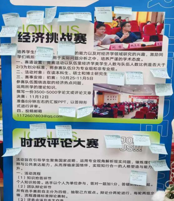 在本次展示活动中,学术部成员为参会同学详细介绍了经济挑战大赛与时政评论大赛的赛事流程、评分标准、热门选题及参与方式,并通过案例点评与互动答疑,帮助大家更具体地理解比赛内容与形式。现场气氛热烈,吸引了众多跨学院同学驻足交流,更有外国友人前来参观,展现赛事的开放性。许多同学在参观后,将对于赛事与题目的看法写在便利贴上并粘贴于易拉宝,形成一道互动交流的风景线。大家对如何将经济理论应用于实践、解决现实问题产生了浓厚兴趣。整场活动有效引导学生在完成实战任务的过程中,将理论知识转化为实践能力,提升专业素养,学会以经济学视角观察现实,以理性逻辑回应社会关切。
