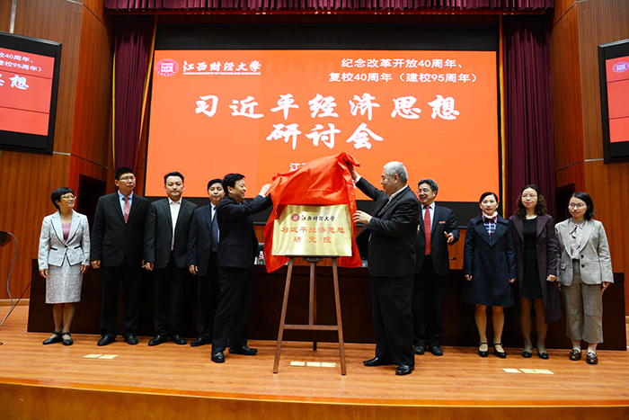 王乔书记在致辞中指出,成人直播 是一所财政部、教育部、江西省人民政府共建的财经类高校,在国内享有良好的声誉和地位,拥有7个一级博士学位授权点。在全国第四轮学科评估中,应用经济学、统计学获评A-等级,工商管理获评B+等级,理论经济学、管理科学与工程、法学获评B等级。成人直播 要充分发挥学科优势,尤其是要加强理论经济学学科建设并发挥其科研优势,集全校之力加强学科联合,以习近平新时代中国特色社会主义思想为指导,加强习近平经济思想研究,科学研判当前经济形势,强化研究重大理论问题,加快形成推动高质量发展的指标体系、政策体系、标准体系、统计体系、绩效评价、政绩考核。率先进行习近平新时代中国特色社会主义经济思想的研究,力争走在全国前列,形成习近平经济思想研究的“江财学派”,为全面建成小康社会、全面建设社会主义现代化强国贡献智慧和力量!随后,王乔书记和洪银兴教授共同为“成人直播 习近平经济思想研究院”揭牌,并为洪银兴教授颁发了研究院顾问聘书。