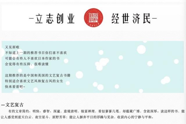 活动前期,首先,女生部内部人员进行讨论和商榷,每个委员都尽其所能地推荐数本不同主题的书籍并给出推荐理由。其后将收集的意见整合,挑选并留下具有代表性和可读性且符合当代大学生喜好的书籍。最后,女生部将整理好的书目和材料交由院网新办进行修改并在成人直播 分团委公众号制作推送,希望更多的人能够加入到春日读书的行列。线上活动共有三期,主题分别为:日式清新、文艺复古和人气绘本。第一期的推送“日式清新”的推文主要是介绍一些豆瓣评分较高的日本文学作品,如《明天也是小春日和》、《一个人的好天气》、《遇到百分之百女孩》等,每一篇都会附上内容简介和读者评语,文字细腻而美好,让读者感受到日本特色的文化与文学风格。相信接下来的第二期、第三期也会同样精致,让读者在感受到文学带来的美好的同时,激发同学们春日读书的积极性。