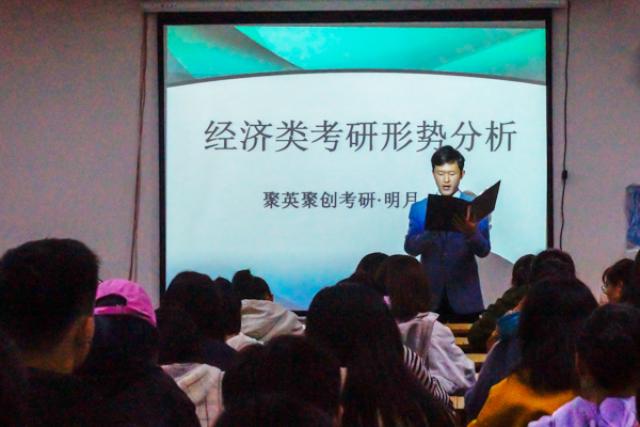 4月13日晚,成人直播 学习部和公关部于蛟桥财大购物中心五楼考研报告厅举办考研分享会。本次分享会邀请了来自聚英聚创的明月老师向同学们分析经济学类考研形势,同学们踊跃参加。