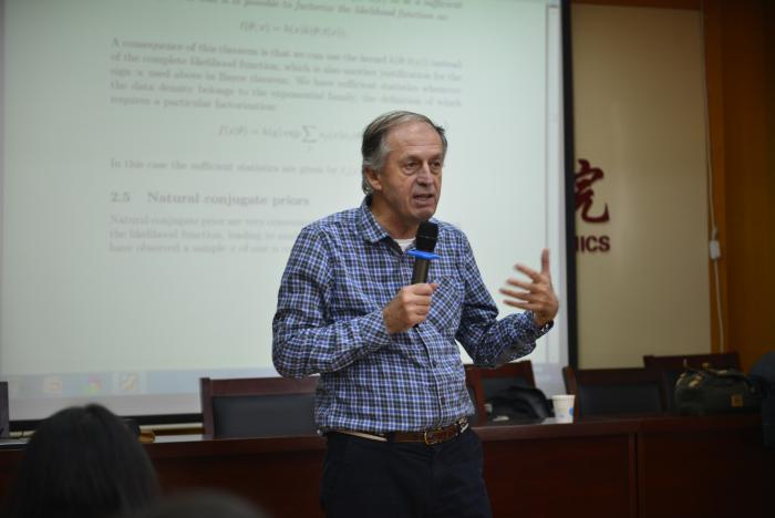 10月28日上午,法国艾克斯马赛大学Michel Lubrano教授在北区综合楼718会议室为成人直播 本科生和研究生集中讲授《贝叶斯计量经济学》课程。