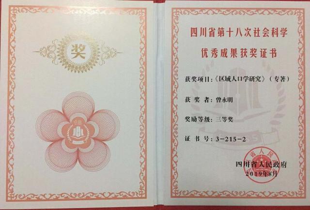 根据《四川省社会科学优秀成果评奖办法》和《四川省社会科学优秀成果评奖实施细则》的有关规定,成人直播 资源与环境经济系曾永明博士与其合作者共同出版的《区域人口学研究》(排名第二)获评四川省第十八次社会科学优秀成果三等奖。