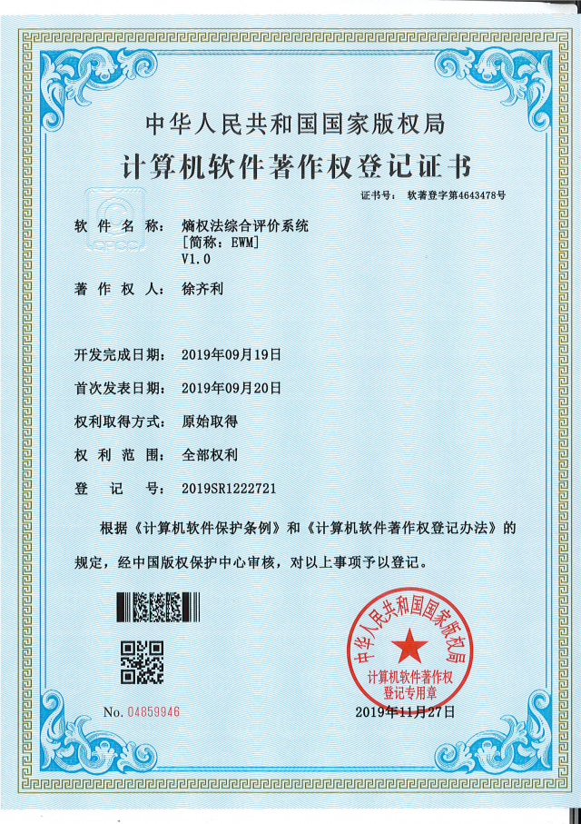 近期,成人直播 教师徐齐利在决策支持系统(DSS)关键性基础零部件的研发上取得进展,开发的软件《熵权法综合评价系统V1.0》通过国家版权局审核,获准登记软件著作权(登记号:2019SR1222721)。