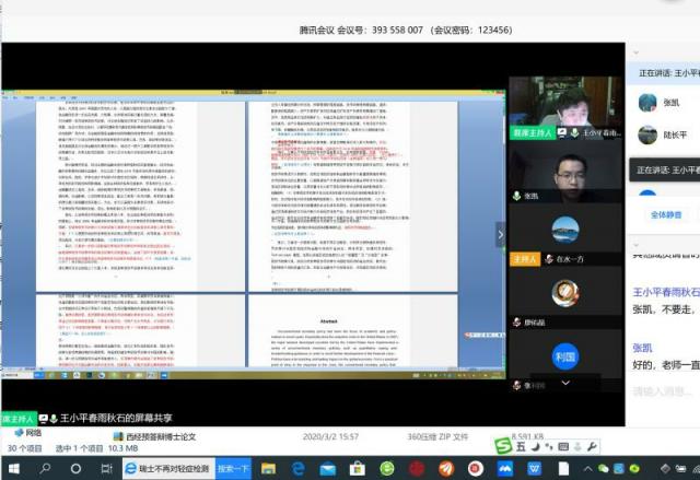3月9日上午九点,经我校研究生院统一部署,经院博士研究生学位论文线上预答辩成功如期举行。张凯、汪亚峰成为成人直播 首批采用网络视频方式进行博士毕业预答辩的学生。答辩委员会主席由成人直播 王小平教授担任,答辩委员包括陆长平教授、张进铭教授、廖卫东教授、黄伟教授、王展翔教授。同时成人直播 院长张利国教授、部分硕博研究生及工作人员在线旁听了此次答辩。