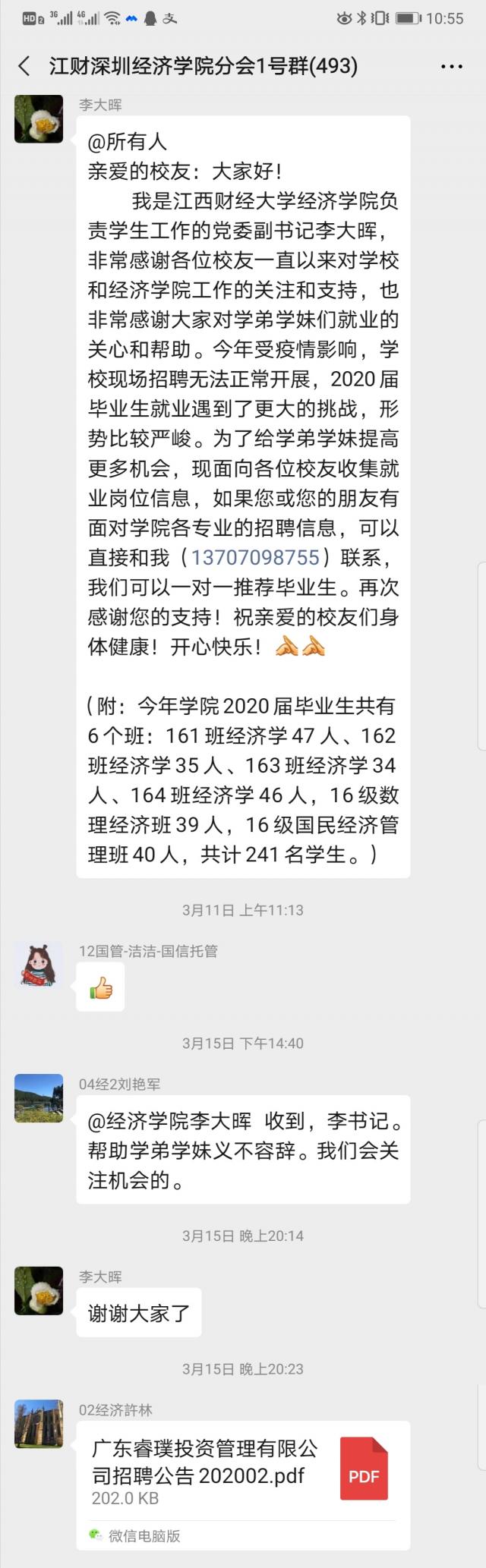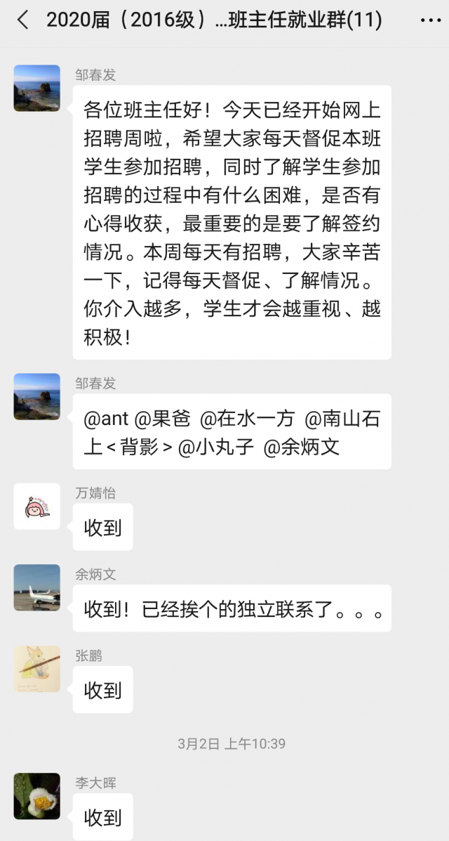 成人直播 院党委书记邹春发在毕业班班主任群里动员大家一定要督促好学生的就业工作,要关心学生面临的具体困难,提供帮助。院党委副书记李大晖在全体2020届毕业生微信群中,给同学们传授网络求职的经验,鼓励同学们在互联网环境下学会毛遂自荐,积极投递简历、联系单位。毕业班班主任老师扎实做好毕业生就业工作,在班级召开就业动员会议,为班上同学修改简历,推荐单位等。学院就业专员吴佩芹带领着院学生会就业部的学生干部积极做好就业动态数据的收集工作,一对一联络毕业班,为毕业班未就业的毕业生匹配符合求职意愿的企业,并向企业推荐毕业生。成人直播 就业指导服务中心还整理出学院典型就业行业、企业和岗位,帮助学生进行职业定位、邀请经验丰富的求职者在微信公众号上推出求职技巧、开通线上咨询渠道,建立毕业生联络微信群和信息收集公共邮箱、为学生提供线上修改简历和求职辅导服务等。