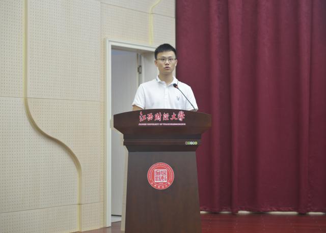 张轶群同学代表全体新生进行发言,他希望自己能在大学生活中不断增强个人实力,收获经验、收获友谊,不负四年大学时光。