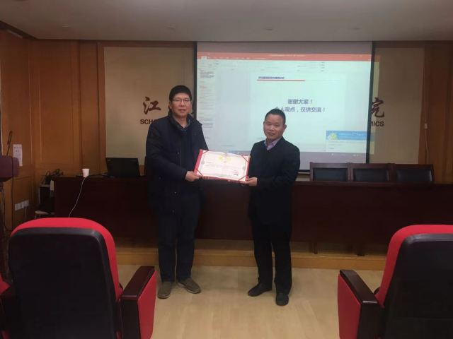 在讲座结束,为了感谢对胡梅根总经理在资产评估行业的杰出贡献及长期对江财资产评估事业的不懈支持帮助,成人直播 聘请胡梅根总经理为成人直播 客座教授。在杨飞虎副院长主持下,张利国院长向胡梅根总经理颁发了客座教授聘用证书。