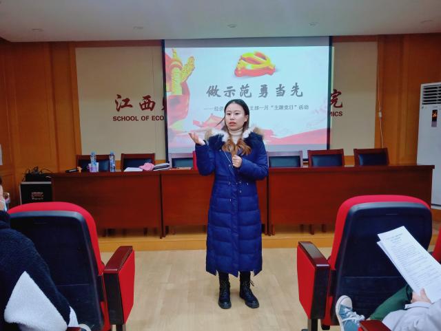 此次会议,万婧怡同志带领大家学习了党的十九届五中全会精神、习近平总书记在全国抗击新冠肺炎疫情表彰大会、省委十四届十二次全会精神以及视察江西重要讲话精神,认真学习《党章》和《中共中央关于加强党的政治建设的意见》《关于巩固深化“不忘初心、牢记使命”主题教育成果的意见》等重要文件,并带领大家观看了《习近平主席2021年新年贺词》视频。