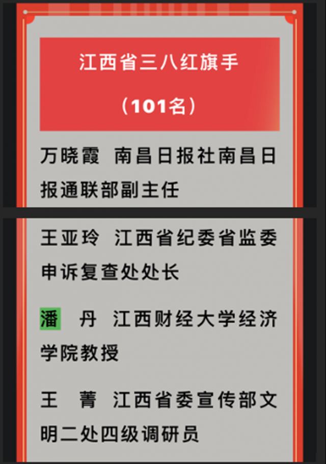 近日,江西省妇女联合会对 2021 年度江西省三八红旗手标兵、江西省三八红旗手(集体)名单予以公示,成人直播 潘丹教授荣获2021年度江西省三八红旗手荣誉称号,为我校2021年唯一位获得此荣誉女老师。 特此恭贺!