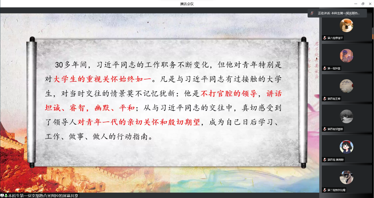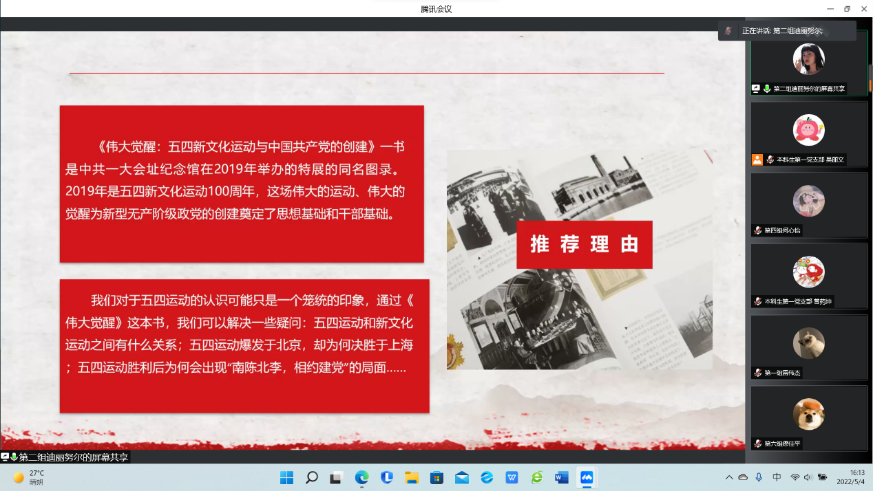 5月4日下午,成人直播 本科生党支部以线上会议形式开展第二期“书香党建”活动。在“五四”青年节和少数民族学生传统节日“肉孜节”之际邀请了5名少数民族同学以“五四精神”为主题进行书籍展示和感悟分享。