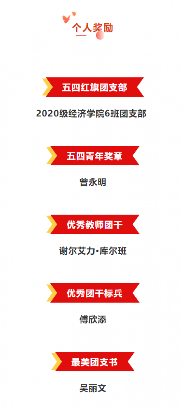 祝贺以上受表彰的先进集体和个人,希望他们再接再厉,继续严格要求自己,以更加饱满的热情投身到学习工作中,以先进典型为榜样,砥砺创新,刻苦学习, 踏实工作,为实现“百年名校”江财梦和中华民族伟大复兴中国梦贡献青春力量!