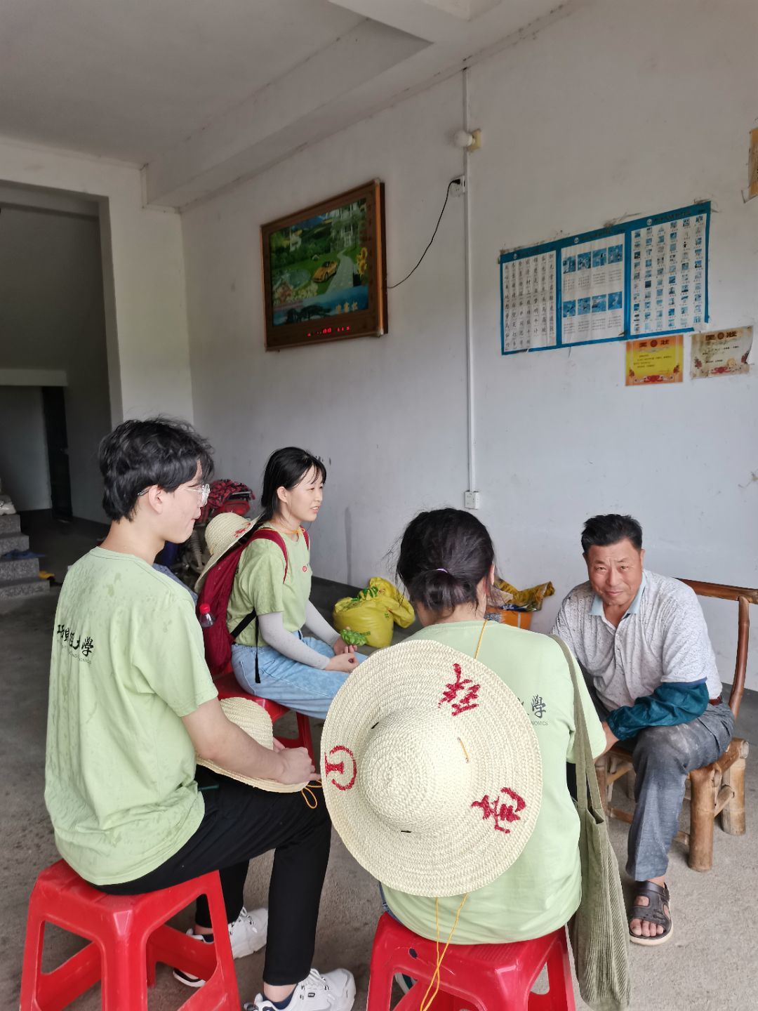 与此同时,田头村小分队前往田头镇边斜村与坪上村。在热心村民的带领下,队员们顺利联系了种粮大户进行调研采访。由于正值农忙季节,多数村民都在田间工作,调研进度稍有停滞,此外还存在语言沟通障碍、农户回答意愿不高、问卷理解困难等问题。但困难总有解决办法,队员们找到能充当“临时翻译”的村民,并耐心地向村民们解释问卷内容,用小礼品调动村民积极性。在傍晚时分,趁着村民们吃完晚饭后的空闲时间,小分队成员再次进行走访,收集了充实的调研数据。