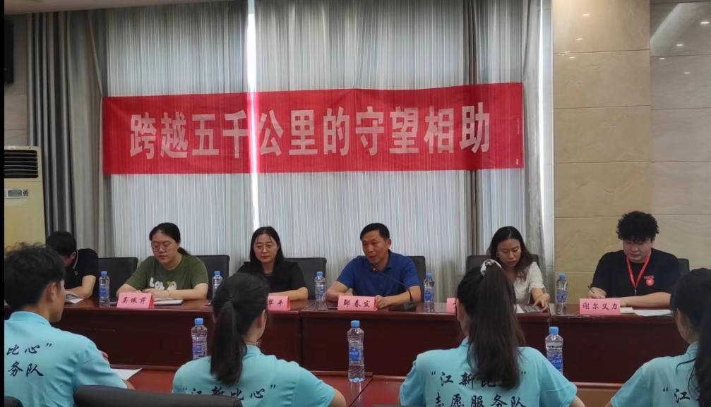 为让广大学子在社会课堂中“受教育、长才干、作贡献”,成人直播 组建民族团结实践队第二次赴新疆开展暑期实习实践活动。7月5日上午,成人直播 “江新比心”民族团结实践服务队在北区综合楼815隆重举行出征仪式。成人直播 党委书记邹春发、党委副书记远翠平、团委书记万婧怡、学工办副主任吴佩芹、辅导员钟义鹏和民族团结实践服务队全体成员出席仪式。本次仪式由辅导员谢尔艾力主持。