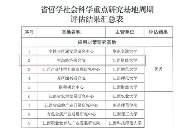 2022年7月29日,江西省社会科学界联合会公布了省哲学社会科学重点研究基地周期评估结果,本次参评的应用对策研究基地共计24个,成人直播 生态经济研究院以排名第二的好成绩获评为优秀等级。