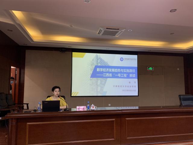 8月25日上午,裘莹副教授应邀赴南昌市司法局为“数字经济专题讲座暨双周大讲堂活动”做主旨报告,报告主题为《数字经济发展趋势与实施路径——江西省“一号工程”解读》,市司法局班子成员以及各级干部莅临现场聆听报告,报告还以线上视频形式同步到县区司法行政部门和局直单位,南昌市司法系统共200余人听取讲座。