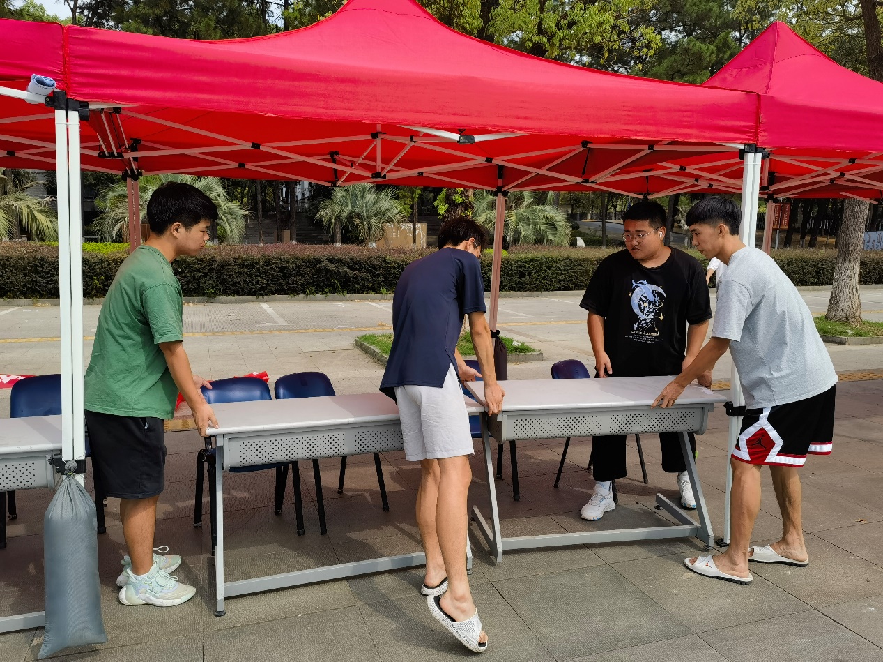9月11日,辅导员谢尔艾力和学生干部积极出动布置迎新场地,搬桌椅、拉横幅、装饰宣传展板,将每项工作安置到位,从白天到夜晚,布置场地的工作才全部完成。