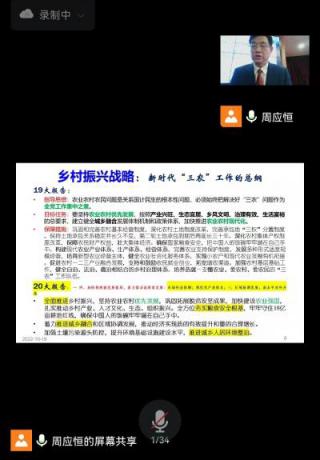 周应恒教授作了“乡村振兴战略的内涵与实施路径”的主题报告,报告首先结合新时代我国社会主要矛盾的转换,应对大变局、构建新格局、开启新征程,详细介绍了乡村振兴战略提出的背景,指出乡村振兴战略体现了习近平总书记关于“三农”工作的重要论述,契合了新时期城乡要素流动的新趋势,突出了将乡村作为一个与城镇平等并行的经济社会空间所具备的功能属性和内生发展动力加以培育,以实现让农村成为安居乐业的美丽家园,让农民成为令人羡慕的职业,让农业成为有奔头的产业。阐释了乡村振兴的内涵变化,重点讲解了农业农村现代化是乡村振兴战略总目标,坚持农业农村优先发展是总方针、产业兴旺、生态宜居、乡风文明、治理有效、生活富裕是总要求。讲解了乡村振兴的总基调、基本原则、目标模式和动力机制。最后,从城乡关系的演变与重构、乡村的多功能性认识、城乡融合发展、推进新型城镇化、振兴乡村产业、乡村建设、农村改革等方面提出了具体实践路径。
