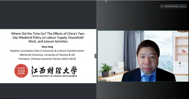 2月23日上午9点,成人直播 开展了纪念成人直播 百年校庆2023年第一次学术活动,邀请到了纽芬兰纪念大学Stephen Jarislowsky讲席教授、加拿大多伦多大学兼职教授、方涛教授在线上进行讲学,本次讲座的主题是:中国双休制政策对劳动力供给、家务劳动和闲暇活动的影响,讲座由夏经霖老师主持,成人直播 及全校师生共计百余人在线参与。