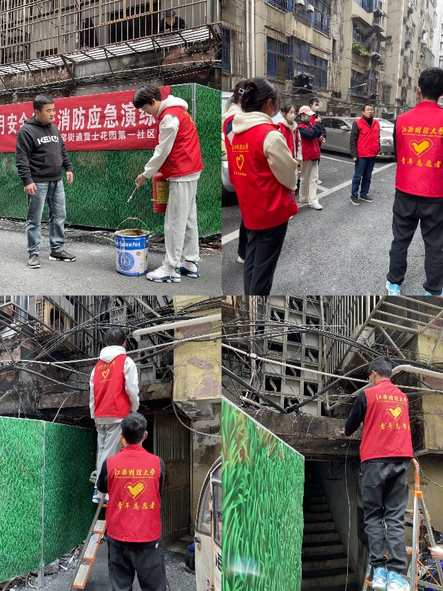 完成清扫任务后,经院志愿者还与社区工作人员一起进行了消防演练。社区工作人员以社区内因电动车着火的场地为例,为大家讲解了灭火器的使用方法,参与活动的人员都觉得十分受益。